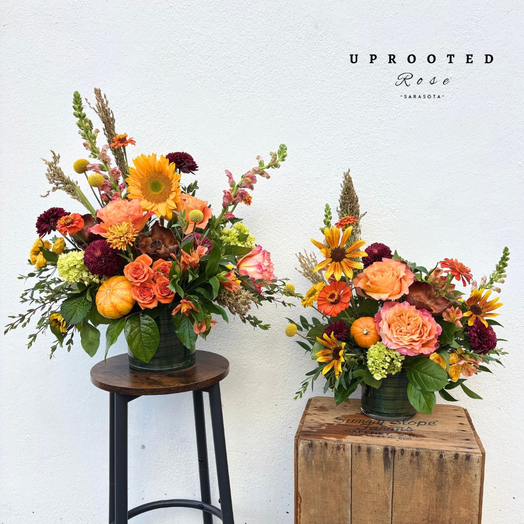 Celebrate the season with Harvest Bliss, a bright and cheerful Thanksgiving arrangement bursting with traditional autumn hues. This festive bouquet brings warmth and joy to your holiday table, combining vibrant oranges, deep reds, and golden yellows that capture the spirit of fall. Perfect for welcoming guests or adding a playful pop of color to your home, Harvest Bliss turns any space into a cozy harvest haven.