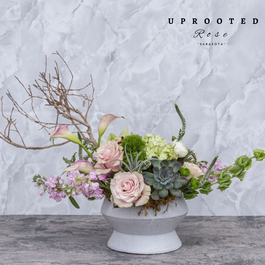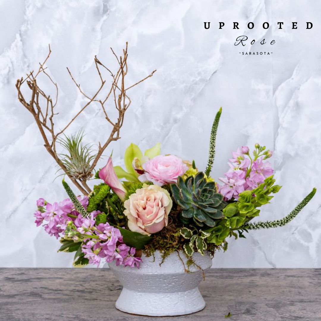 Discover the magic of the Enchanted arrangement, where charming succulents, whimsical airplants, rustic branches, and vibrant fresh flowers come together to create a playful burst of nature’s wonder. Perfect for brightening any space with a touch of enchantment and lively charm.